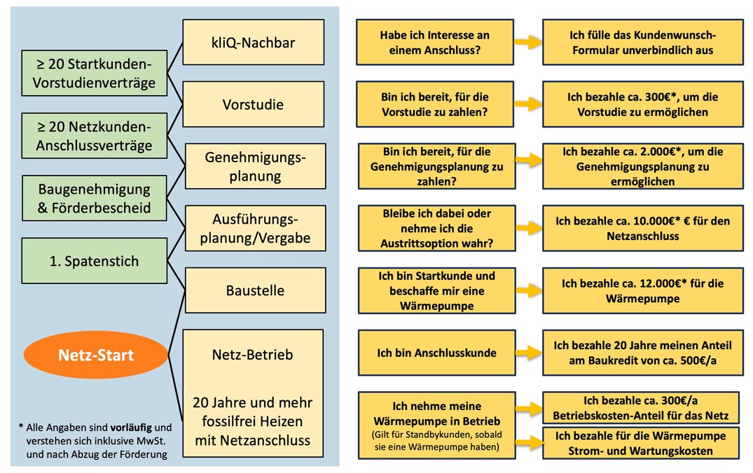 haben keinen Anspruch auf einen Anschluss an das Nahwärmenetz. Funktioniert ihre Gas- oder Ölheizung nicht mehr, müssen sie sich selbst um eine neue Lösung kümmern oder müssen für ihren Netzanschluss auf eine spätere Ausbaustufe des Netzes warten. Ob und wann eine weitere Ausbaustufe realisiert wird, ist unsicher, denn die Bewilligung von Fördermitteln für den Bau von Ausbaustufen hängt wieder von der Anzahl und Dichte der Interessenten in Projektgebiet ab.